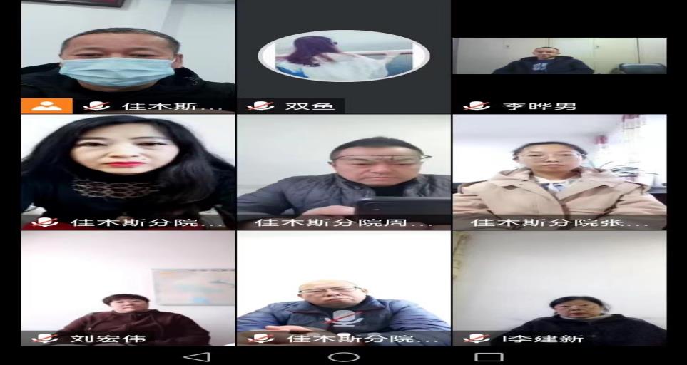 佳木斯院区职工在会议室参会,带岭院区职工通过腾讯会议在各自工作岗位上参会。