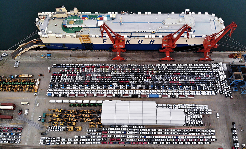 商品车在山东港口青岛港码头等候装船(2022年8月7日摄,无人机照片)。新华社记者李紫恒 摄