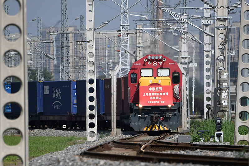 满载土库曼斯坦甘草中药材原料的中欧班列回程列车抵达西安国际港站(2022年8月31日摄)。新华社记者李一博 摄