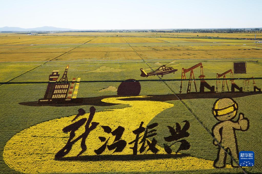 在北大荒集团建三江分公司七星农场有限公司的一块稻田里,一幅“喜迎二十大引领新征程”的稻田画,吸引不少游客驻足观看。登上观景台,遍野金黄,一派丰收景象。