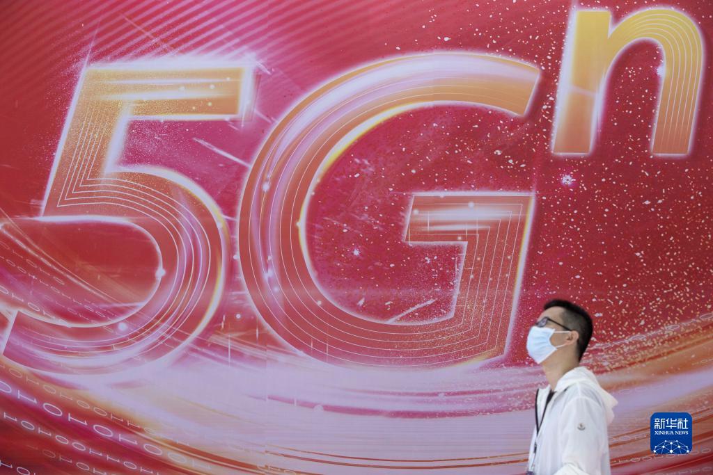 在2022世界5G大会展厅里,一名参展商走过展板(2022年8月10日摄)。新华社记者张涛 摄