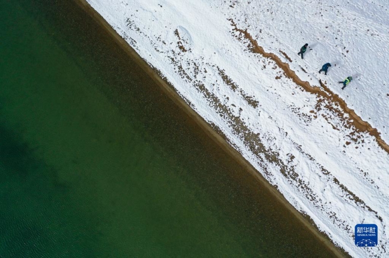 在青海省果洛藏族自治州玛多县扎陵湖乡勒那村,三江源国家公园黄河源园区生态管护员在巡护(2021年10月20日摄,无人机照片)。新华社记者 张龙 摄