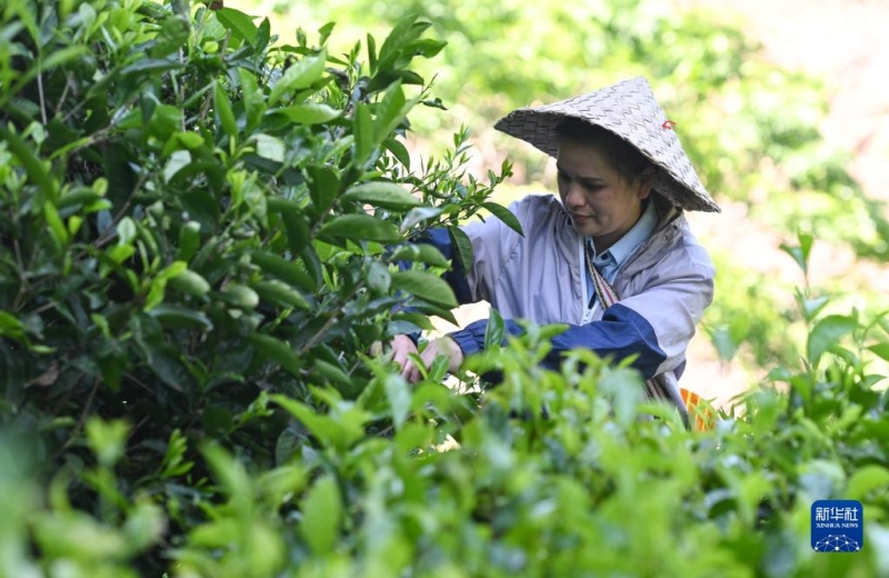 海南省五指山市水满乡毛纳村茶农在茶园采茶(2022年4月10日摄)。新华社记者 杨冠宇 摄