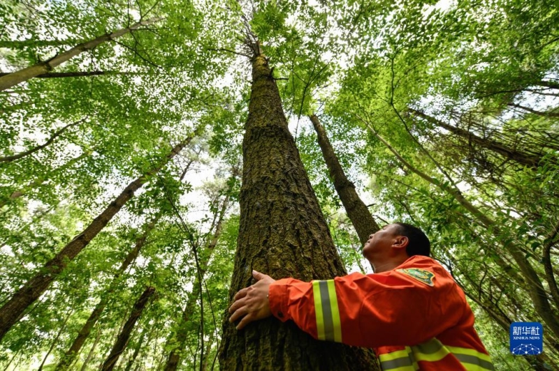 在贵州省贵阳市国家级森林公园,村级林长郭健用手量一棵树的直径(2022年7月13日摄)。新华社记者 杨文斌 摄