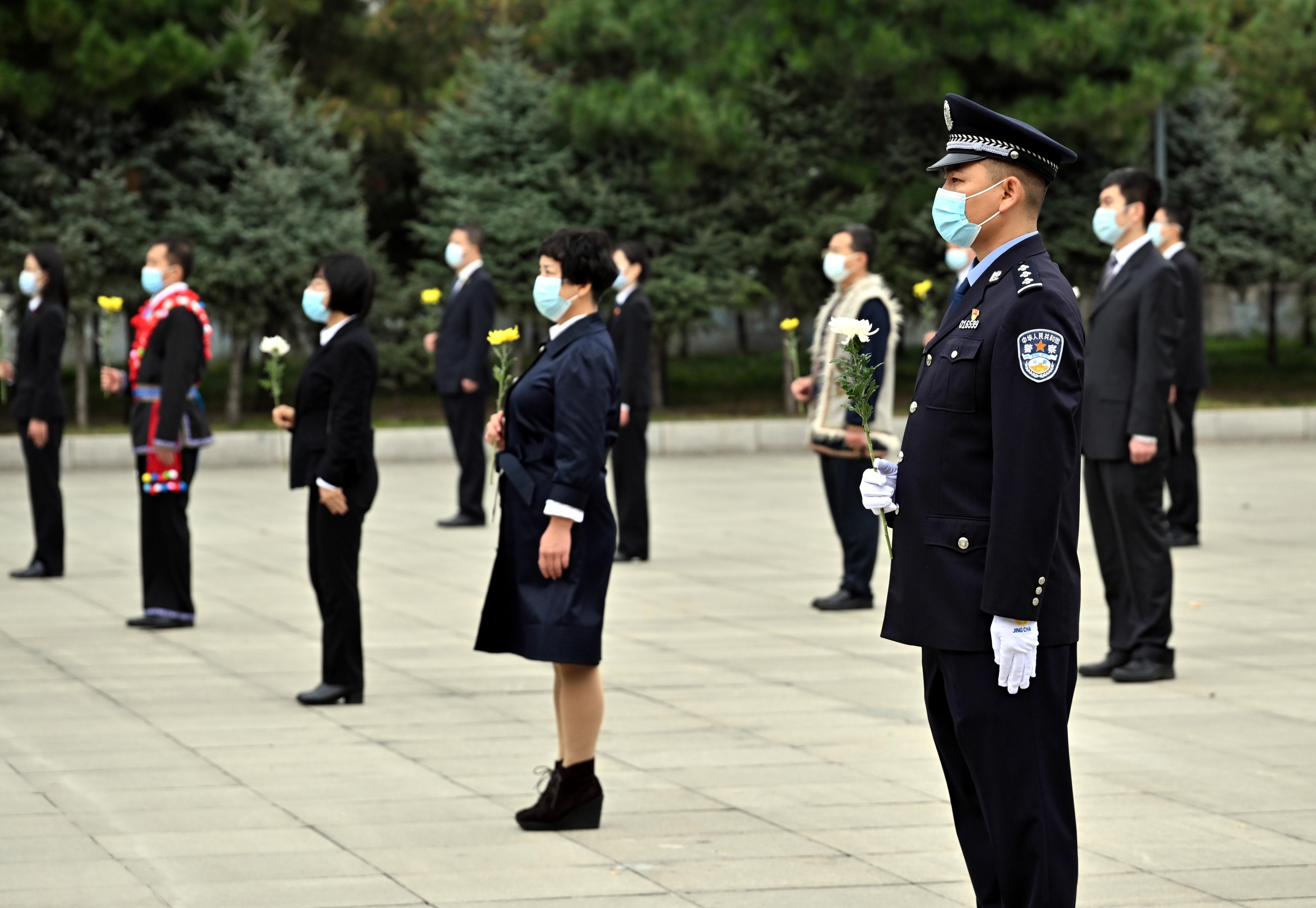 秋日的长青公园内苍松翠柏掩映、气氛肃穆庄严,东北抗日暨爱国自卫战争烈士纪念塔巍然耸立,塔身正面镌刻的鎏金大字格外醒目,省市领导和各界代表面向纪念塔肃然伫立,表达对烈士的缅怀追思。